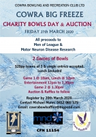 Bowls Day (2 games of bowls, $20 pp, teams of 3), Lunch including the Cowra Big Freeze (locals getting dunked into a tank of ice) and Auctions of signed sporting items.