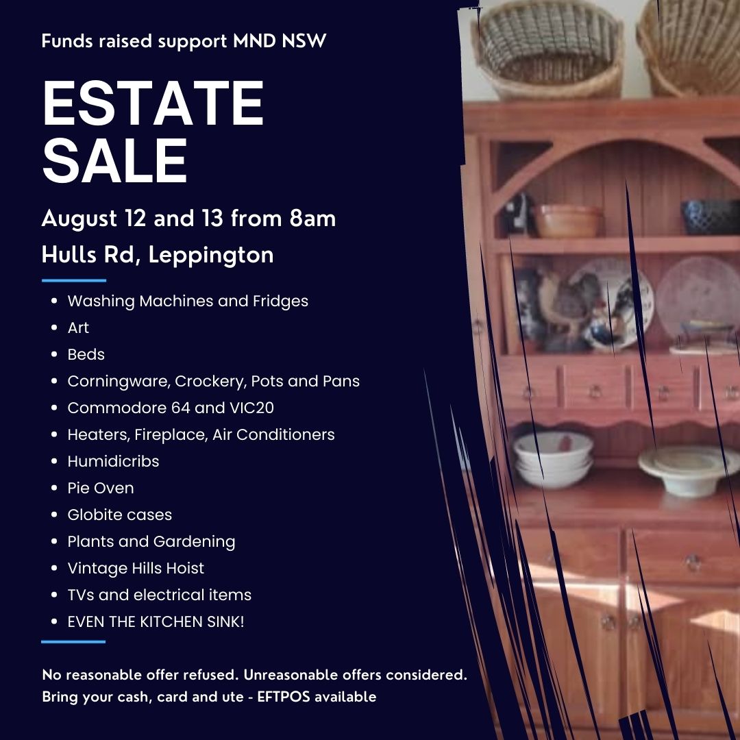 Don't miss the estate sale happening in aid of MND NSW on August 12 and 13 at Hulls Rd Leppington!