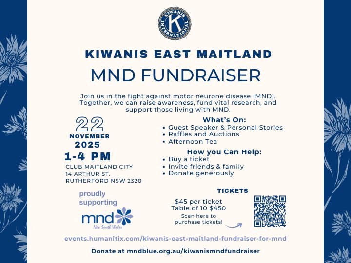 Join East Maitland Kiwanis for an afternoon tea fundraiser in aid of MND NSW. Help them raise awareness, fund vital research, and support those living with MND.