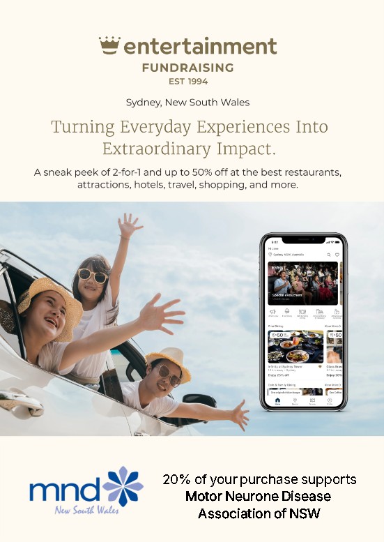 We are fundraising with Entertainment to raise funds for the support people living with MND, AND to bring you the opportunity to save money on just about everything - from groceries and fuel to dining out, travelling, shopping and fun activities. Become an Entertainment Member to unlock thousands of 2-for-1 offers and 50% off deals.