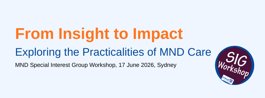 The MND Special Interest Group (SIG) Workshop is for health and community care professionals who have an interest in Motor Neurone Disease (MND). People living with MND and their family members are also welcome to attend without cost.