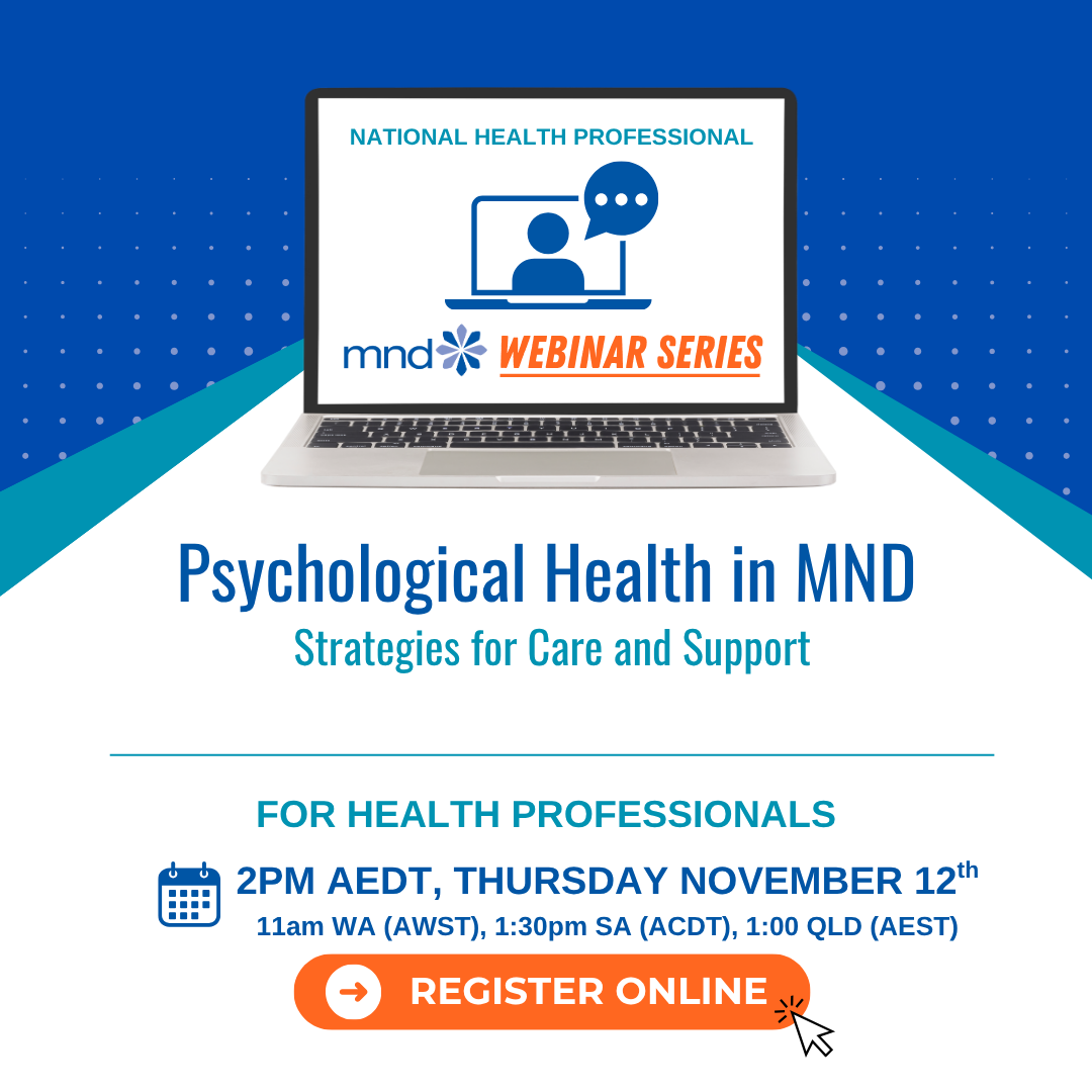 Hosted by MND NSW, this session will explore the impact of MND on the psychological health and wellbeing of the person diagnosed with the disease as well as their family and support network.
